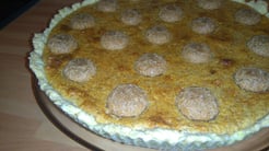 Nun eine 28er Backform einfetten, mit Mehl bestäuben und den Mürbeteig ausrollen und die Form damit auskleiden, der Rand sollte ca. 2cm hoch sein. Mehrfach mit der Gabel einstechen.