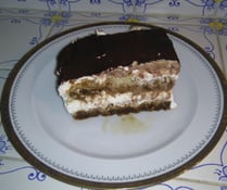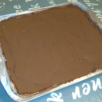 Nun ist die erste Biskuitschicht fertig und kann einmal gleichmäßig mit der Creme bedeckt werden. Auf die erste Cremeschicht folgt nun eine zweite Biskuitschicht. Solltet ihr merken, dass ihr schon mehr als die Hälfte des Kaffees verbraucht hat, dann könnt ihr ihn auch etwas mit Wasser auffüllen. Wenn wiederum die zweite Biskuitschicht komplett ist, bedeckt ihr sie wieder mit der Creme und siebt anschließend etwas (ungesüßtes) Kakaopulver über die Creme.
