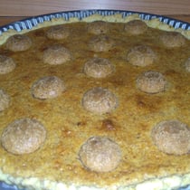 Nun eine 28er Backform einfetten, mit Mehl bestäuben und den Mürbeteig ausrollen und die Form damit auskleiden, der Rand sollte ca. 2cm hoch sein. Mehrfach mit der Gabel einstechen.
