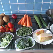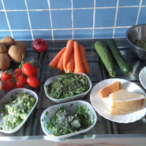 Die Zwiebeln ganz klein hacken und im Olivenöl anschwitzen, die bereits geschälten und kleine geschnittenen Kartoffeln ebenfalls anschwitzen. Die Tomaten klein schneiden, hinzufügen und den Herd auf kleine Flamme stellen. Karotten in Scheiben, Brokkoli in mundgerechten Stücken, Erbsen, Spinat und eine Hand voll klein gehackten Sellerie zugeben und mit Wasser aufgießen, bis alles Gemüse mit Wasser bedeckt ist. Den Herd wieder auf große Flamme stellen und aufkochen lassen.
